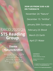 In our inaugural year (2019-2020), the STS Reading Group was convened by Heather Latimer (Gender & Women’s Studies) and Natalie Forssman (Anthropology), and focused on texts that challenged the naturalization of Kinship, as defined through hereditary, biological relations and legal regimes. In 2020-2021 our theme was Nature/Artifice and the group was led by Heather Latimer and Margaret Carlyle (History & Sociology). For 2021-2022 our theme was Reproductive Technologies and the group sessions included several guest speakers , such as: